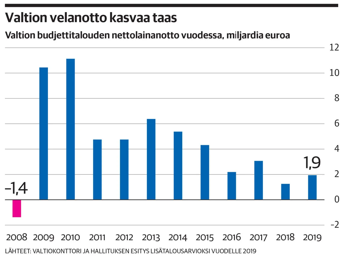 Kuitenkin yli 10 miljardia euroa hallitus on eduskunnan siunauksella käyttänyt aivan muihin kohteisiin. Pidättäytymällä osasta päätösperäisistä menolisäyksistä, hallitus olisi siis voinut halutessaan vähentää velanottoa.